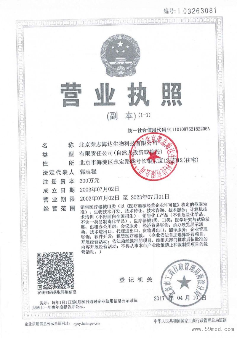 | 發(fā)證機(jī)構(gòu): | ??北京市工商行政管理局海淀分局 | 發(fā)證時間 : | ??2017-04-10 |