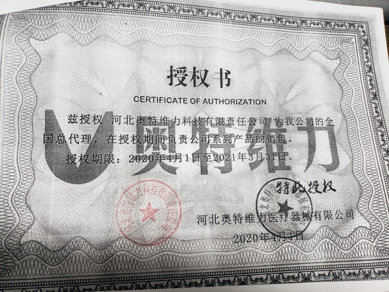 | 發(fā)證機(jī)構(gòu): | ??河北奧特維力醫(yī)療器械有限公司 | 發(fā)證時(shí)間 : | ??2020-04-01 |