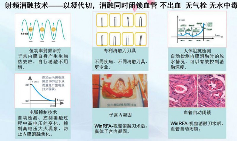 WinRFA•視窗消融刀是在雙重可視的監(jiān)控下,通過具有剪切、止血、凝固、剔除四大功能的消融刀具經(jīng)陰道、宮頸等自然腔道,將射頻電磁波準(zhǔn)確地介入到病變部位上,射頻電磁波激發(fā)病變組織的細(xì)胞進(jìn)行等離子振蕩,離子相互摩擦產(chǎn)生生物高熱效應(yīng),溫度達(dá)到80-100度,從而有效的消融病變組織并凝固血管,射頻治療系統(tǒng)能智能控制病變組織的變性程度和范圍,最后使病變組織變性、壞死和排出體外,達(dá)到治療子宮出血(DUB)、子宮切口(瘢痕)妊娠、腺肌瘤(?。┑燃膊〉哪康?。