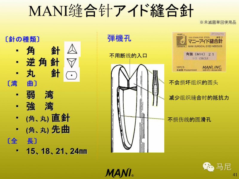 而馬尼的縫合針有如下特點