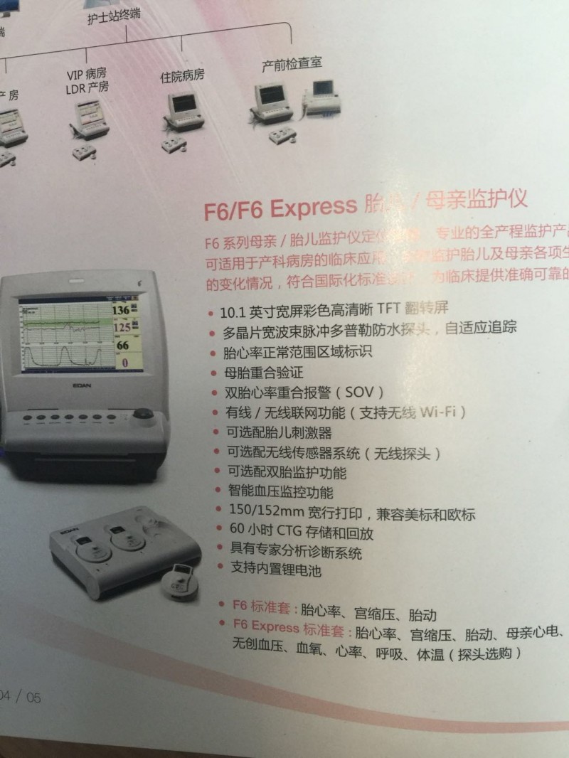 功能特點: 寬屏幕10寸彩色高清晰TFT翻轉(zhuǎn)屏 隱藏式提手,方便移動 多晶片寬波束脈沖多普勒防水探頭,自適應(yīng)追蹤 胎心率120-160bpm正常范圍區(qū)域標識 CCV雙胎率重合報警 開機音樂及音樂提示音提示定時打印完畢 12小時CTG存儲和回放 152mm寬行打印,兼容美國和國際標準 25mm/s高速回放打印 支持缺紙緩存打印,選段打印和定時打印 F6胎兒監(jiān)護儀可同步顯示和打印胎兒活動圖曲線 有線/無線聯(lián)網(wǎng)功能 F6 胎兒/母親監(jiān)護儀。