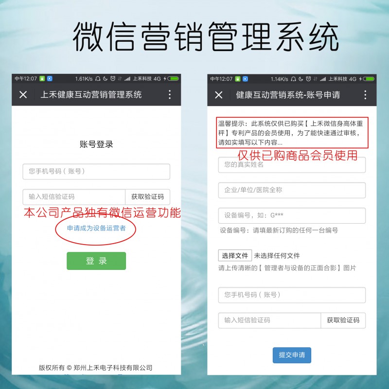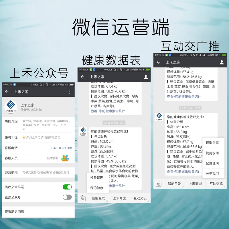 鄭州上禾電子科技有限公司是集產(chǎn)品研發(fā)、生產(chǎn)的高新技術(shù)科技企業(yè)。公司致力于智能互聯(lián)健康體檢設(shè)備(身高體重秤、多功能體檢機、健康一體機)研發(fā)與制造,在健康體檢、健康綜合管理、云健康等領(lǐng)域擁有多年產(chǎn)品研發(fā)及客戶合作經(jīng)驗。公司自主研發(fā)的智能互聯(lián)設(shè)備,已獲得多項專利。產(chǎn)品已經(jīng)出口20多個國家和地區(qū)。我們將不斷努力為客戶提供優(yōu)質(zhì)的產(chǎn)品及技術(shù)支持。上禾科技愿與社會各界合作,竭誠為您提供品質(zhì)的產(chǎn)品及服務(wù)。